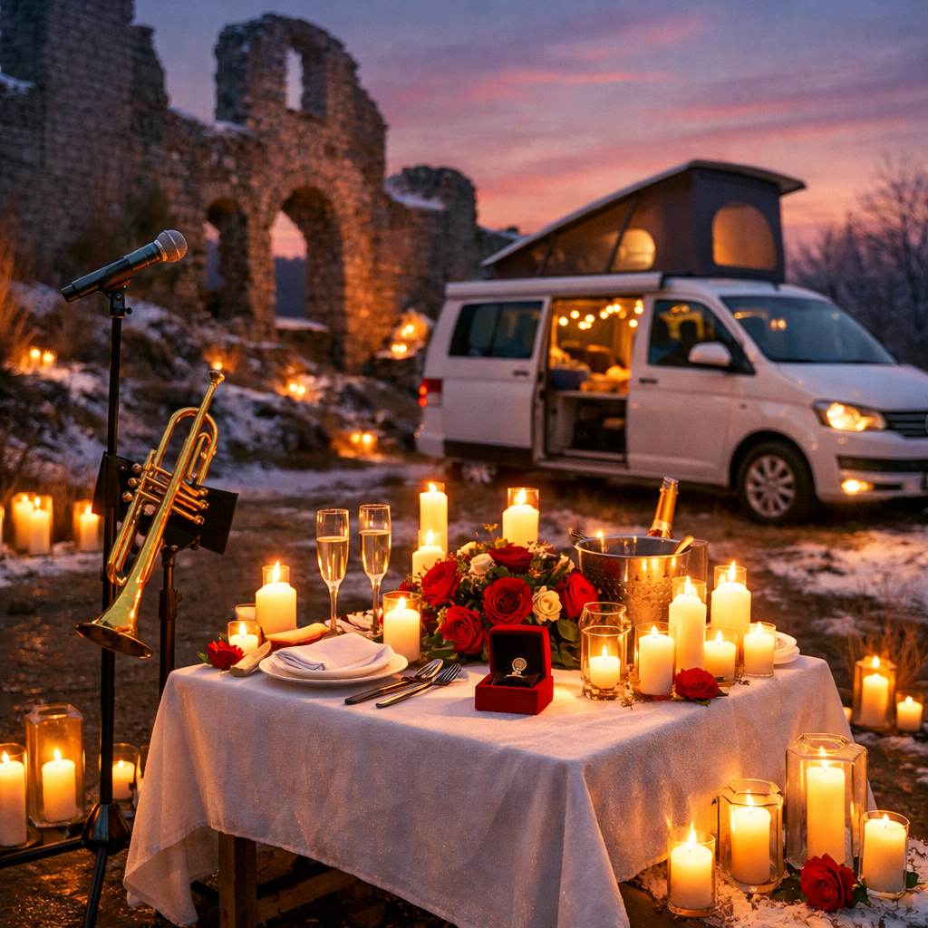 Die Dämmerung legt sich über die alte Burg und die Natur, unzählige Kerzen flackern, Lieblingsblumen, ein gedeckter Tisch und dann – Musik. Live und echt. Nur für Euch zwei.